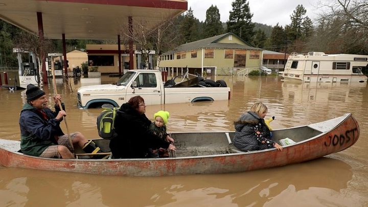 "Z Guerneville je teď ostrov. Všechny příjezdové cesty jsou zaplavené a nesjízdné," varovala policie z okresu Sonoma na sociálních sítích. Hladina řeky Russian River vystoupala až k hranici 14 metrů, na které kulminovala. Tato úroveň hladiny je největší za posledních 25 let.